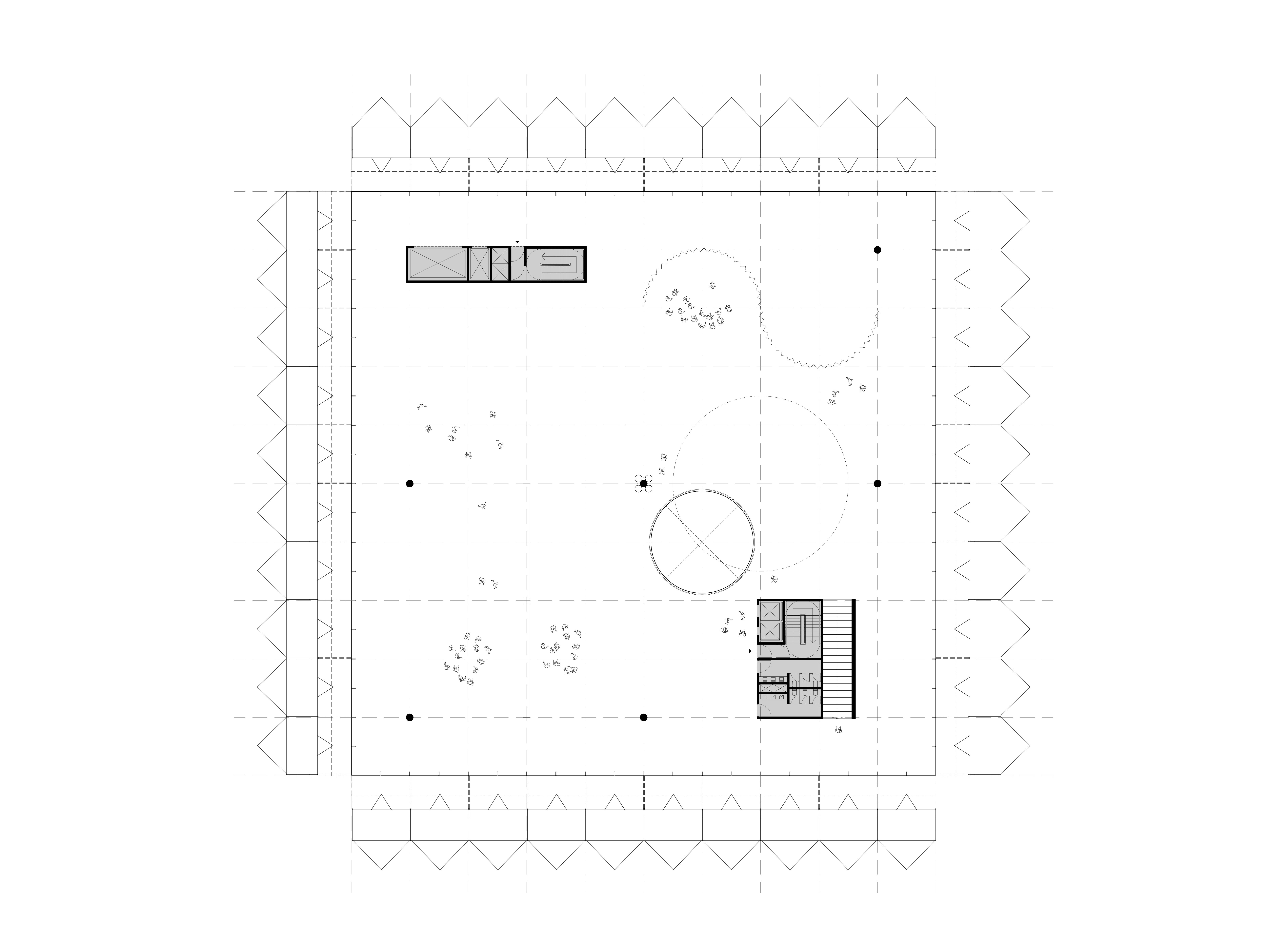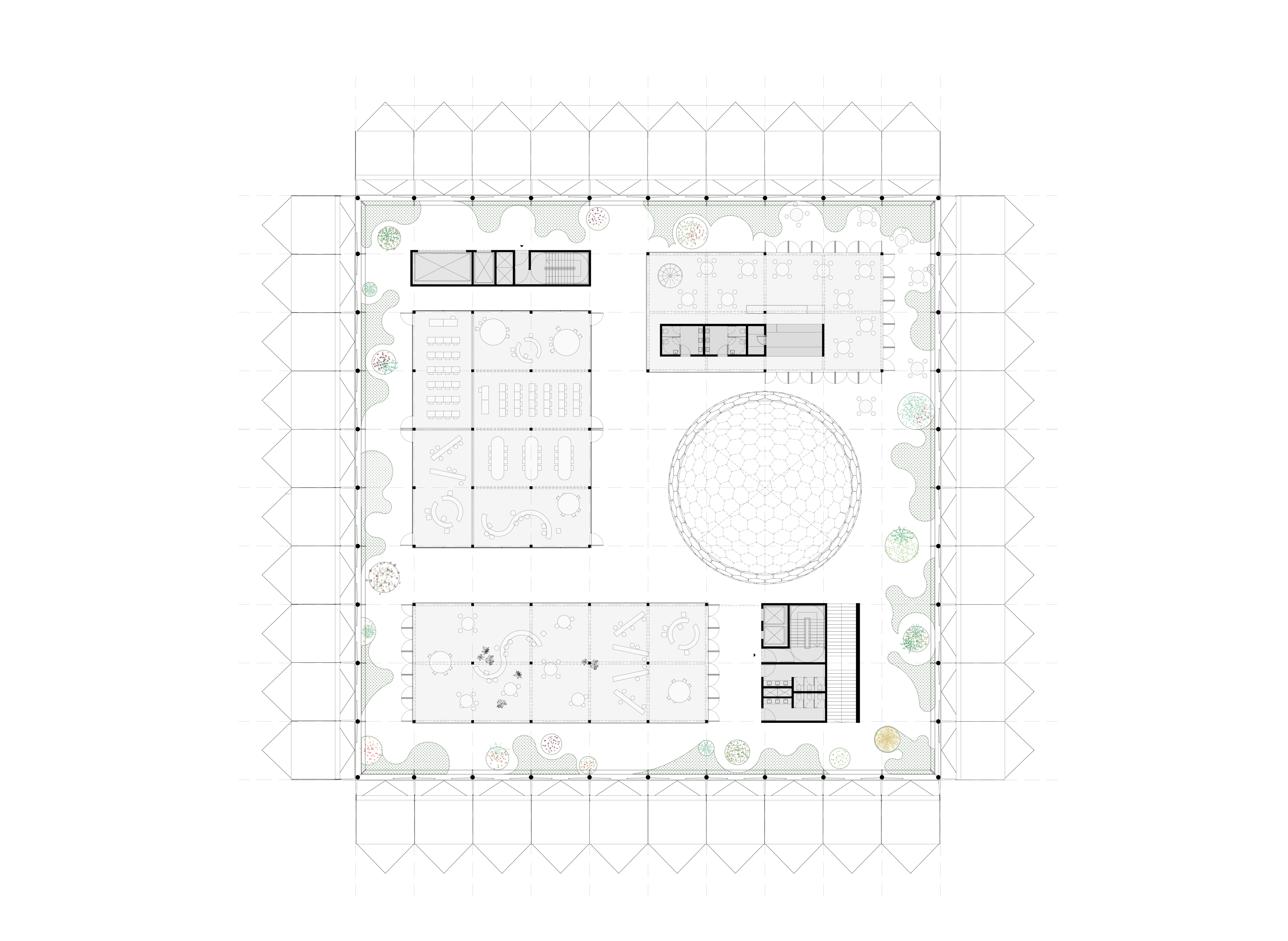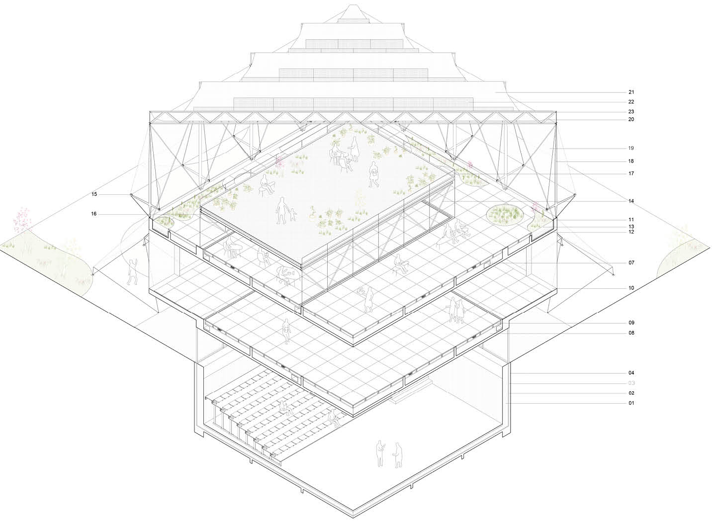 El volumen se compacta y estratifica, apilando el programa para minimizar la pisada sobre el parque permitiendo ampliar las superficies a cielo abierto.
