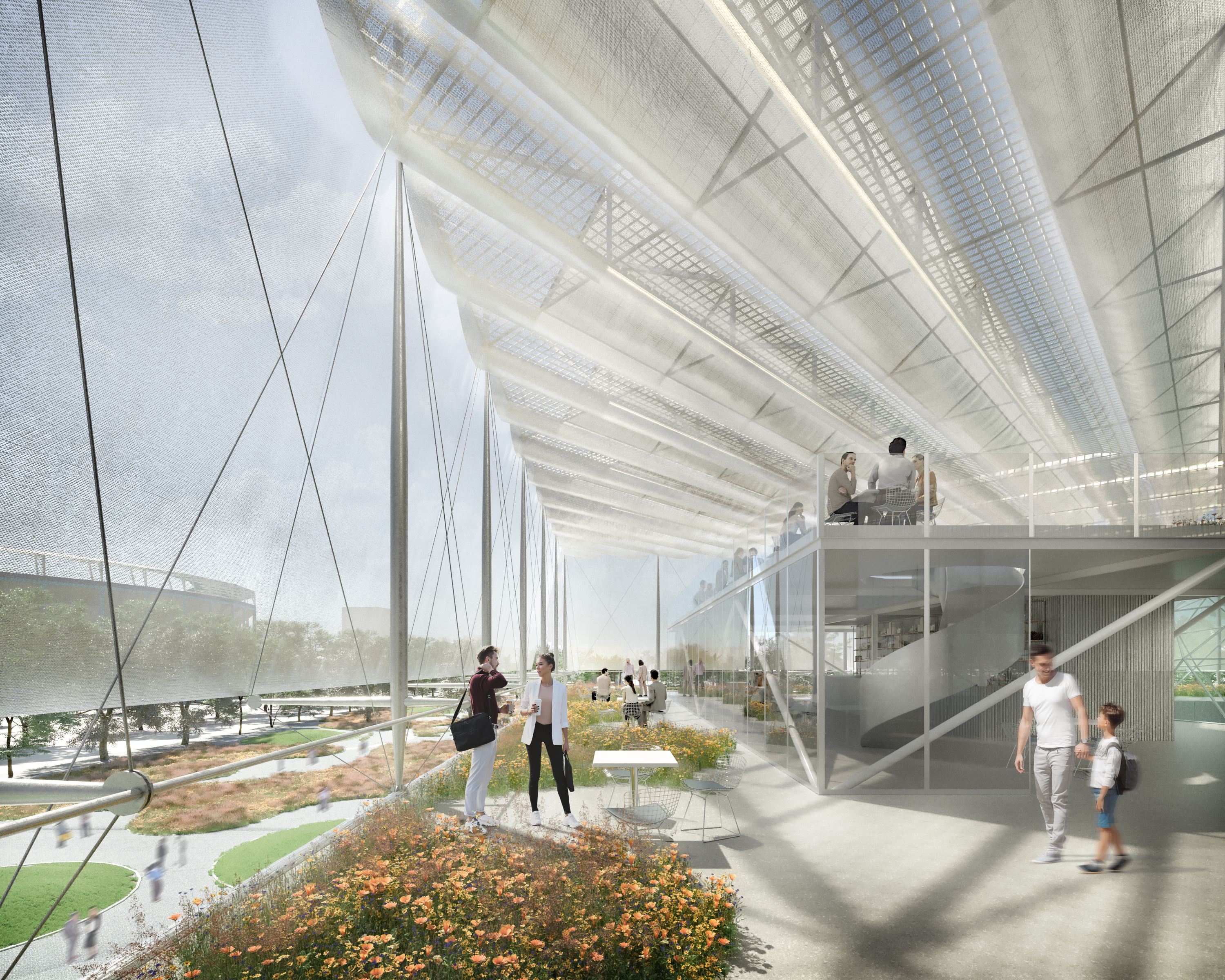 Este espacio abierto y difuso, concebido como jardín interior que da continuidad al parque en altura, es un mirador urbano de carácter público y abierto