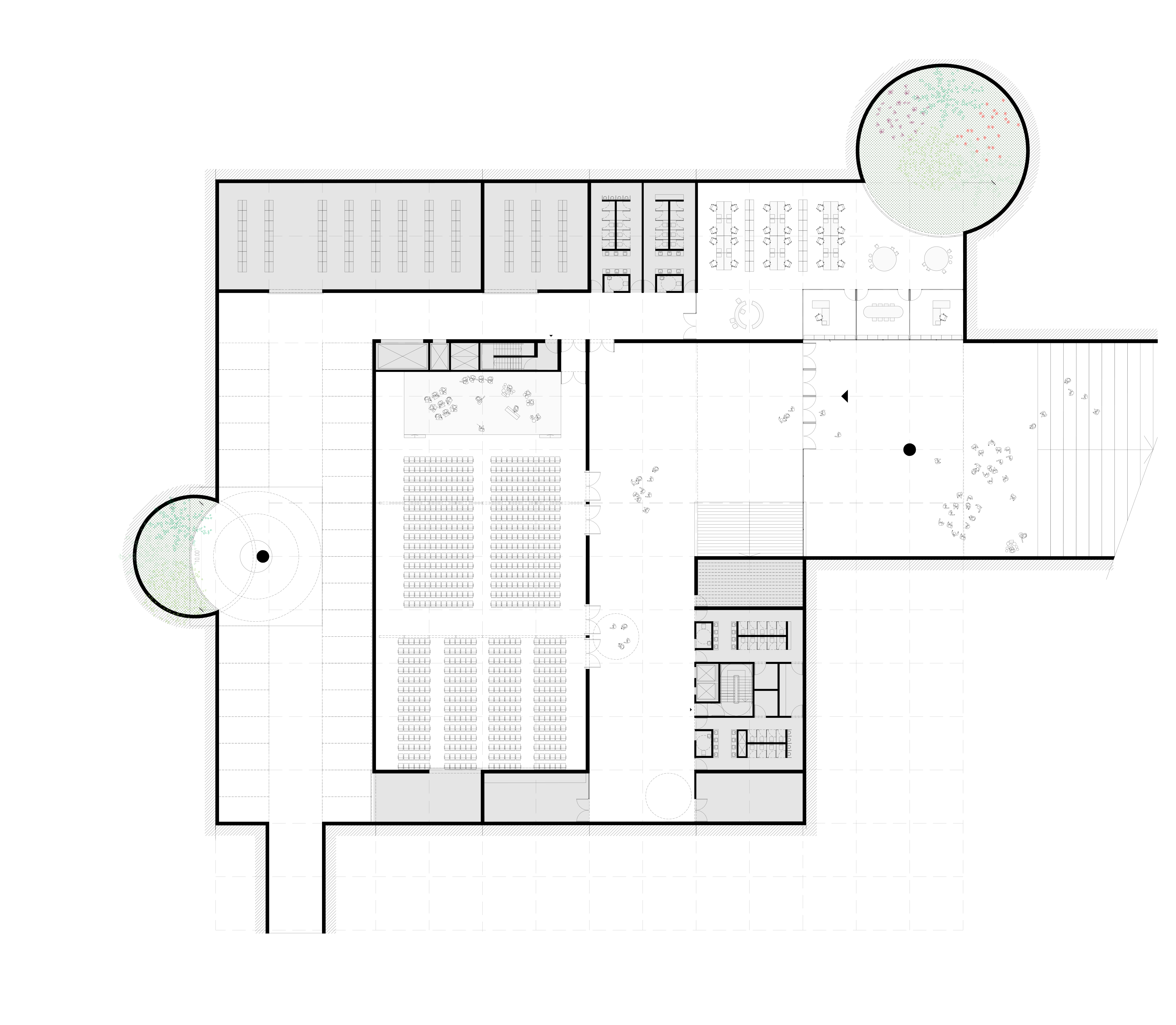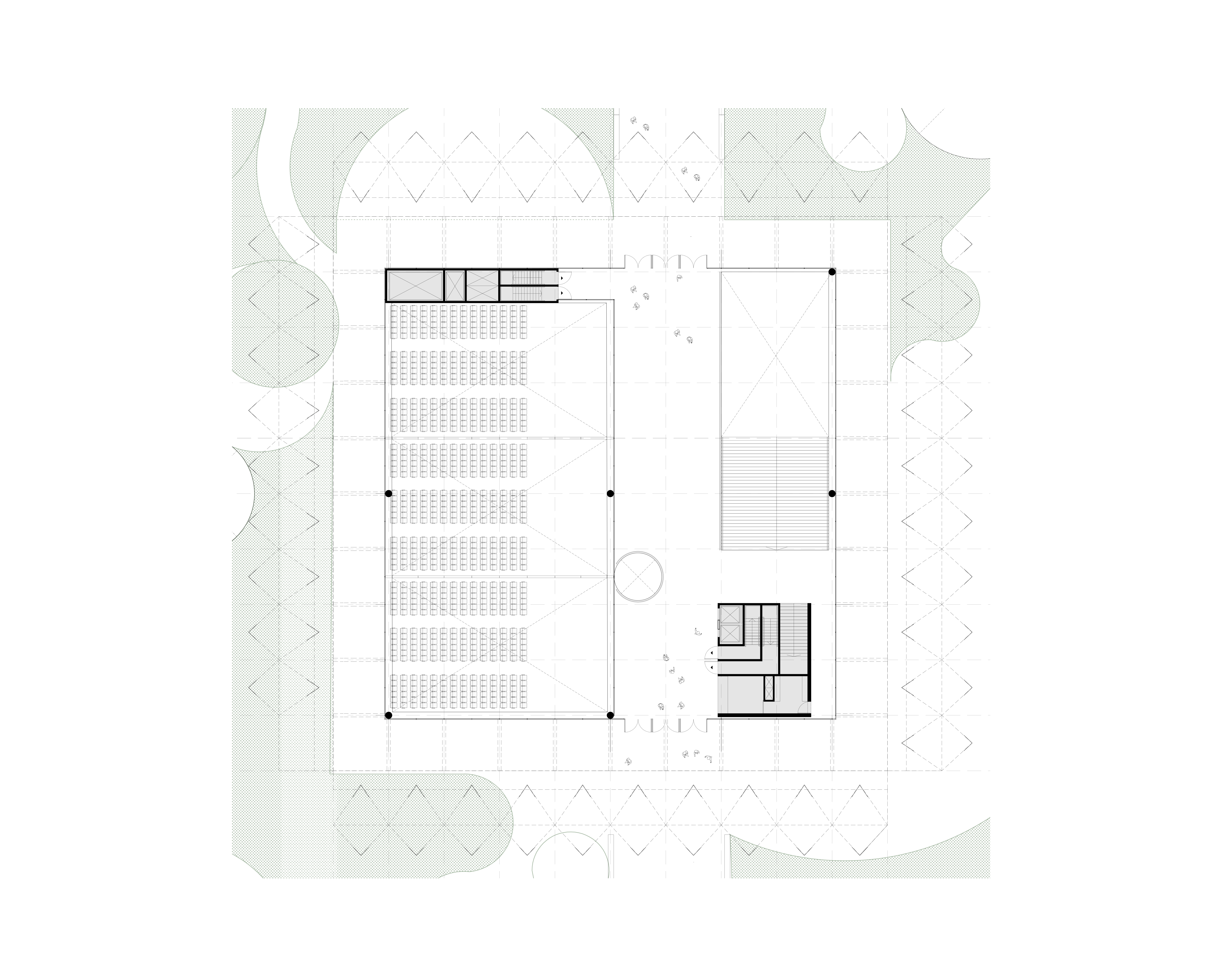 adyacentes. A través de unas gradas que conforman un anfiteatro, se accede al primer subsuelo de forma independiente al foyer del auditorio, para